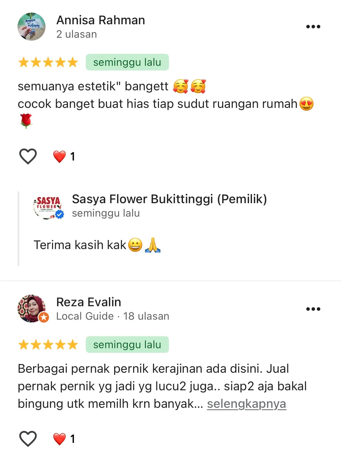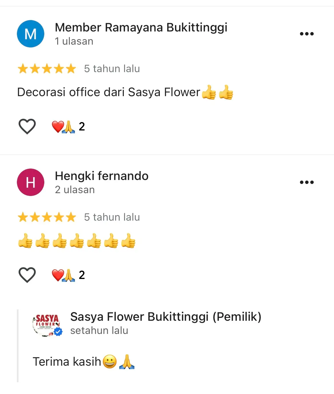 Kami memahami bahwa setiap pelanggan memiliki kebutuhan dan cerita yang berbeda. Oleh karena itu, Sasya Flower selalu mengutamakan pelayanan yang ramah, responsif, dan profesional agar setiap pengalaman berbelanja menjadi menyenangkan dan berkesan.